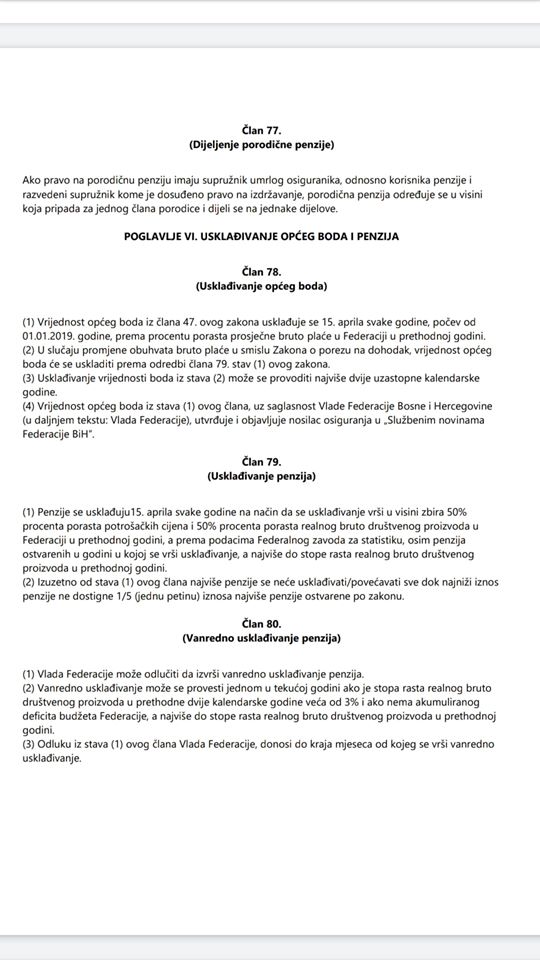 U skladi sa čl.79 Zakona PIO/MIO F BiH i ostvarenog suficita od 60 miliona KM u 2019.godini, Vlada Federacije je dužna da 15.4.2020.godine izvrši usklađivanje penzija, povećanje za 3% i isplatu za Januar, Februar, Mart i April 2020.godine jer su se za to stekli Zakonski uslovi.