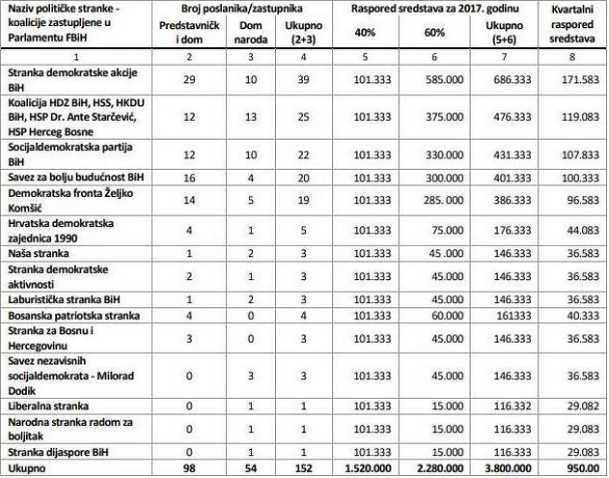Najviše novca Vlada FBiH za 2017. je dodijelila Stranci demokratske akcije (SDA) i to ukupno 686.333 KM. SDA u oba doma Parlamenta FBiH ima ukupno 39 zastupnika. Nakon toga slijede stranke okupljene u koaliciji koju predvodi HDZ BiH, a tu su još HSS, HKDU BiH, HSP dr. Ante Starčević te HSP Herceg Bosne. HDZ-ova koalicija prošle godine je dobila 476.000 KM, a ukupno imaju 25 zastupnika u Parlamentu FBiH.