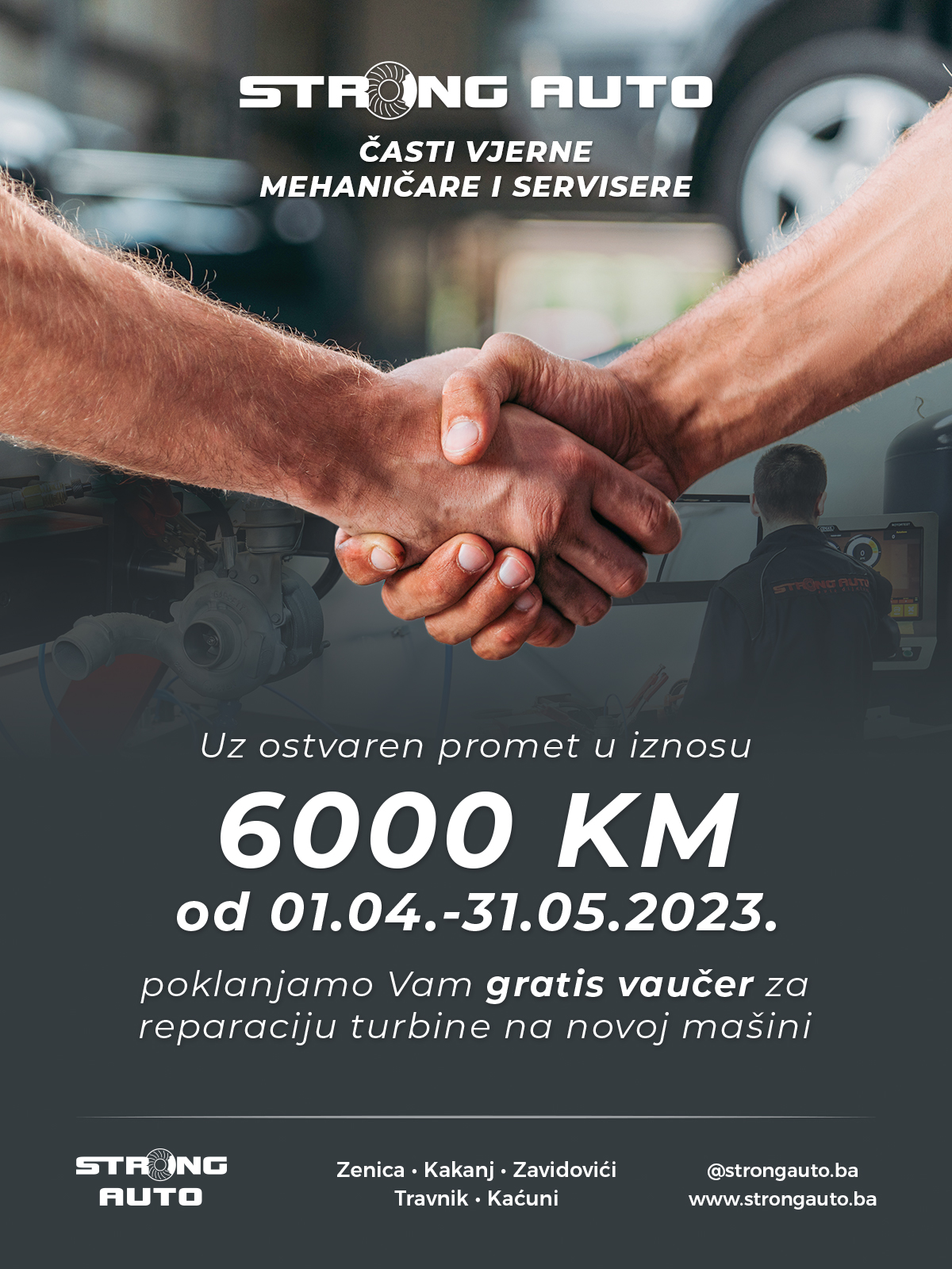 Svi automehaničari i vlasnici auto servisa koji ostvare promet u iznosu od 6.000 KM u periodu od 01.04.-31.05.2023. STRONG AUTO poklanja gratis vaučer za reparaciju turbine na novoj mašini.