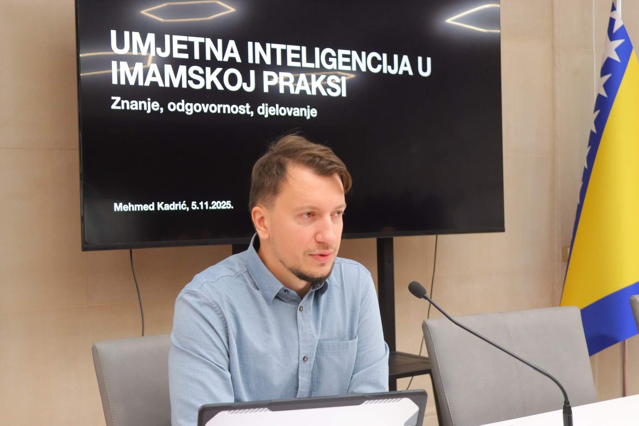 O temi Umjetna inteligencija u imamskoj praksi – znanje, odgovornost i djelovanje govorio je mr. Mehmed Kadrić, inžinjer elektrotehnike, koji je naznačenu temu obradio interdisciplinarno – upoznavši imame sa osnovnom terminologijom, značajem i ulogom vještačke inteligencije u društvenom kontekstu u kojem djeluju. Posebnu pažnju posvetio je primjerima dobre prakse i mogućnostima primjene vještačke inteligencije u edukativnom, imamskom i džematskom radu.