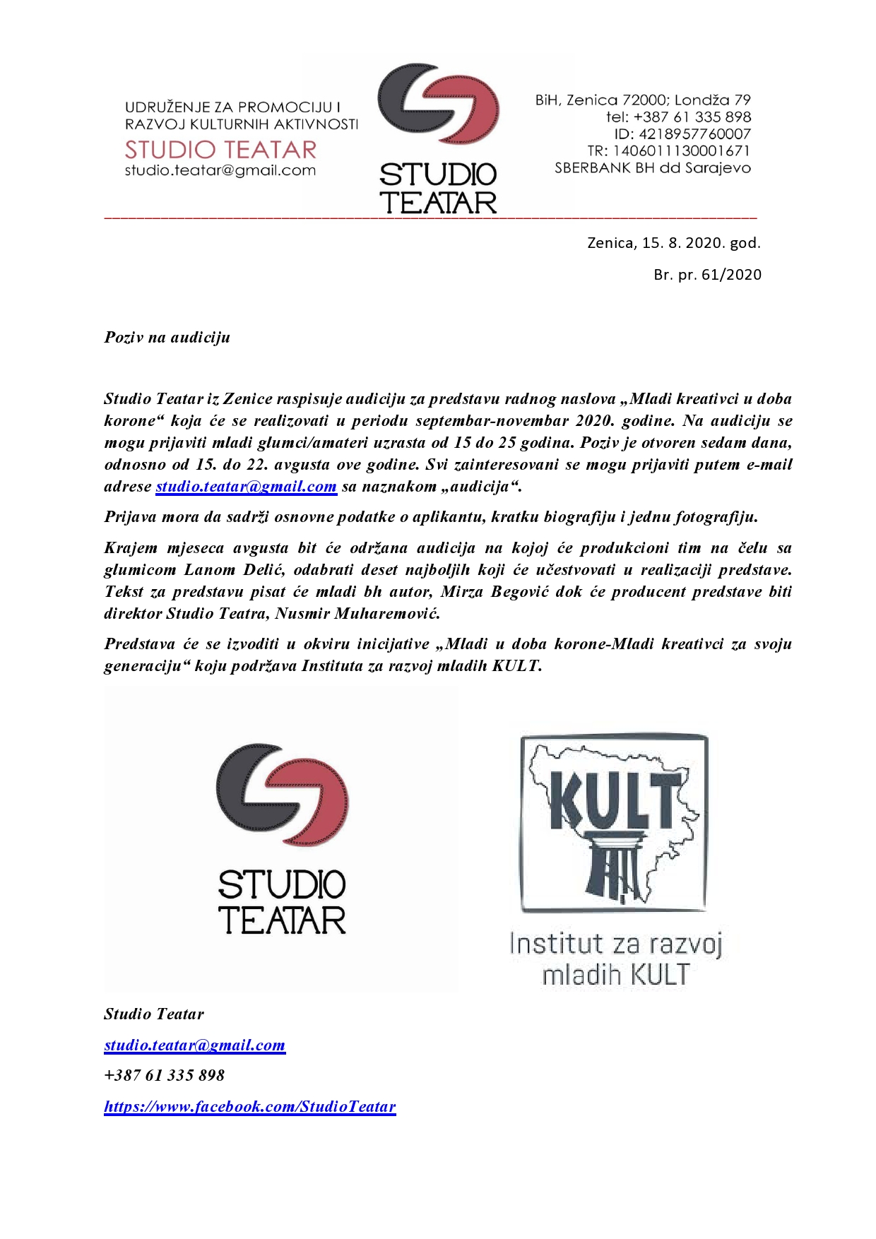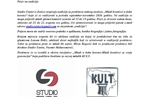 Studio Teatar iz Zenice raspisuje audiciju za predstavu radnog naslova „Mladi kreativci u doba korone“ koja će se realizovati u periodu septembar-novembar 2020. godine. Na audiciju se mogu prijaviti mladi glumci/amateri uzrasta od 15 do 25 godina.