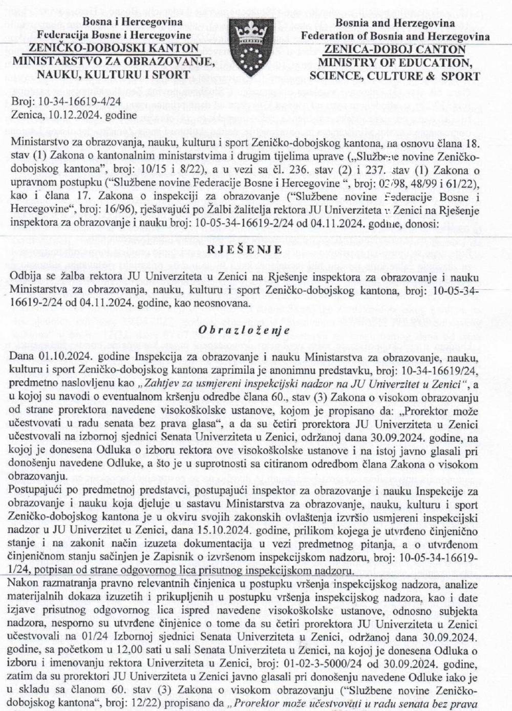 Naime, Univerzitetu Zenica je resorno ministarstvo Rješenjem od 4. novembra prošle godine naredilo da omogući primjenu člana 60. stav 3. Zakona o visokom obrazovanju, te dostavi dokaz o izvršenju naložene upravne mjere.