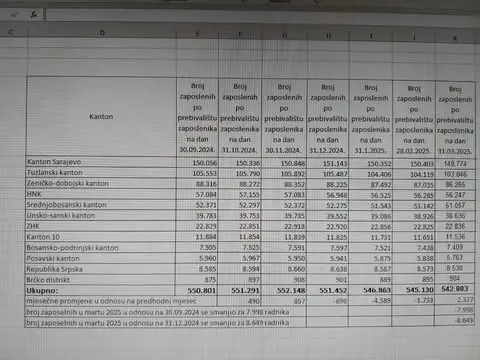 Jedino u Kantonu Sarajevo jeste povećan broj zaposlenih za 1.504 osobe u odnosu na period januar – mart 2024. godine.