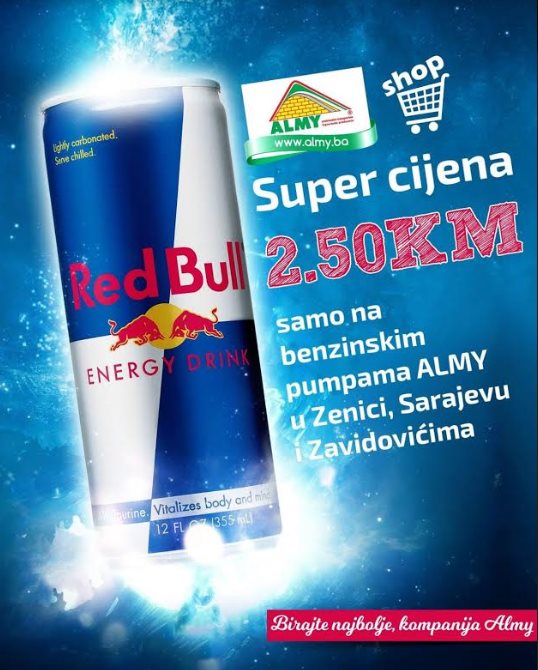 Super cijena energetskog pića Red Bull u marketima benzinskih pumpi Almy u Zenici, Zavidovićima i Sarajevu.