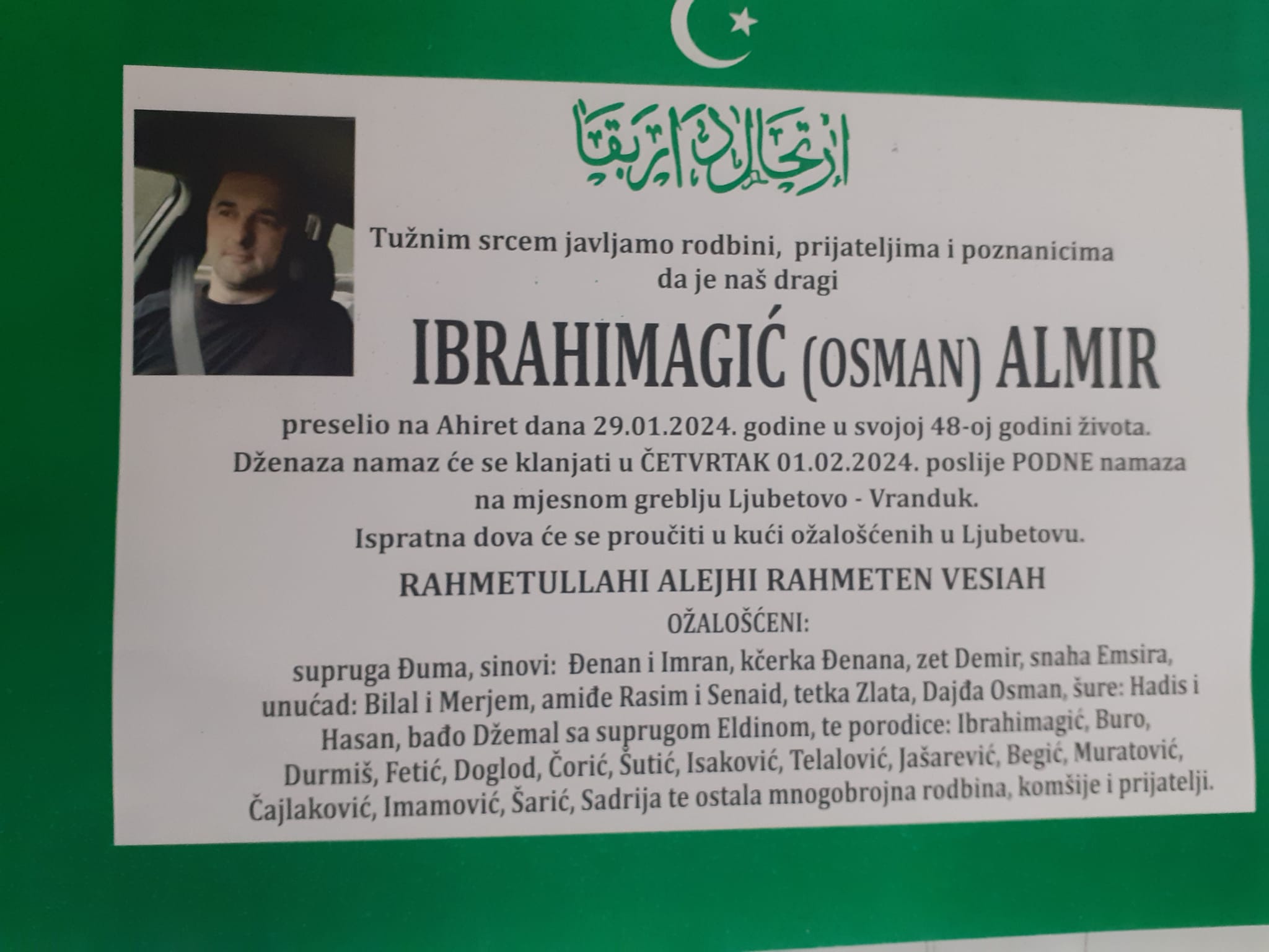 U ovoj teškoj nesreći smrtno je stradao Zeničanin Almir Ibrahimagić kojem će dženaza biti klanjana sutra (1. februar/četvrtak) poslije podne namaza na mjesnom greblju Ljubetovo – Vranduk.