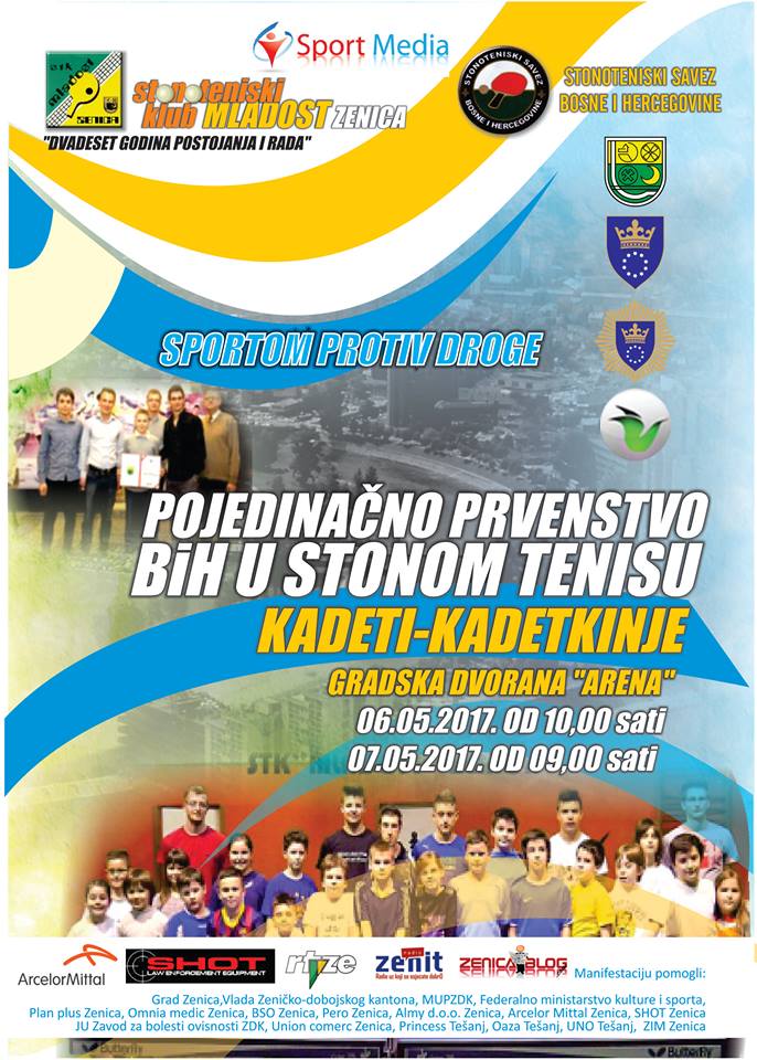 -Tim povodom klub Stk Mladost Zenica i stonoteniski savez BiH organizuju 06. i 07.05.2017. godine u zeničkoj Areni, pojedinačno prvenstvo BiH u stonom tenisu za kadete/kadetkinje (do 15 godina). Takmičenje u subotu počinje od 10,00 sati, kada je predviđeno i svečano otvorenje, a u nedjelju od 09,00 sati, kada su na rasporedu završni mečevi, te borba za medalje. Na prvenstvu će učestvovati 80 takmičara, (53 u muškoj i 27 u ženskoj konkurenciji) najboljih kadeta i kadetkinja iz cijele Bosne i Hercegovine (Zenica, Banja Luka, Sarajevo, Prijedor, Tuzla, Ilijaš, Cazin, Brčko, Foča i drugi)-, kazao je, pored ostalog, Mustafa Dizdarević.