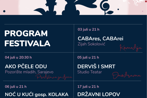 U ponedjeljak, 04. jula, najmlađa publika će imati priliku da uživa u predstavi Pozorišta mladih Sarajevo „Ako pčele odu“. Ova predstava za djecu „koju vole i odrasli“, aktuelizira moguće izumiranje pčela te na zabavan i edukativan način govori o tom problemu, ali i upozoravajući koliko su ta mala bića važna za čovječanstvo. U predstavi igraju Ajla Cabrera, Alma Merunka, Suada Ahmetašević, Edhem Husić, Mirza Dervišić, Edin Avdagić i Armin Omerović.