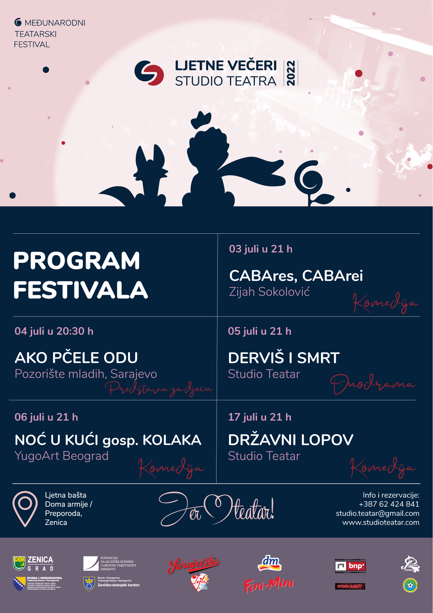 Festival se održava na Ljetnoj sceni Doma armije/Preporoda u Zenici, a sve predstave za odrasle počinju u 21:00 sat, dok predstava za djecu počinje u 20 sati i 30 minuta. Rezervacije ulaznica za predstave moguće je izvršiti putem broja telefona 062 424 841, ili upitom na E-mail adresu [email protected]. Također, sve informacije o samom festivalu Ljetne večeri Studio Teatra moguće je dobiti i na službenoj stranici Studio Teatra www.studiorteatar.com, kao i na službenim stranicama na društvenim mrežana facebook i instagram.