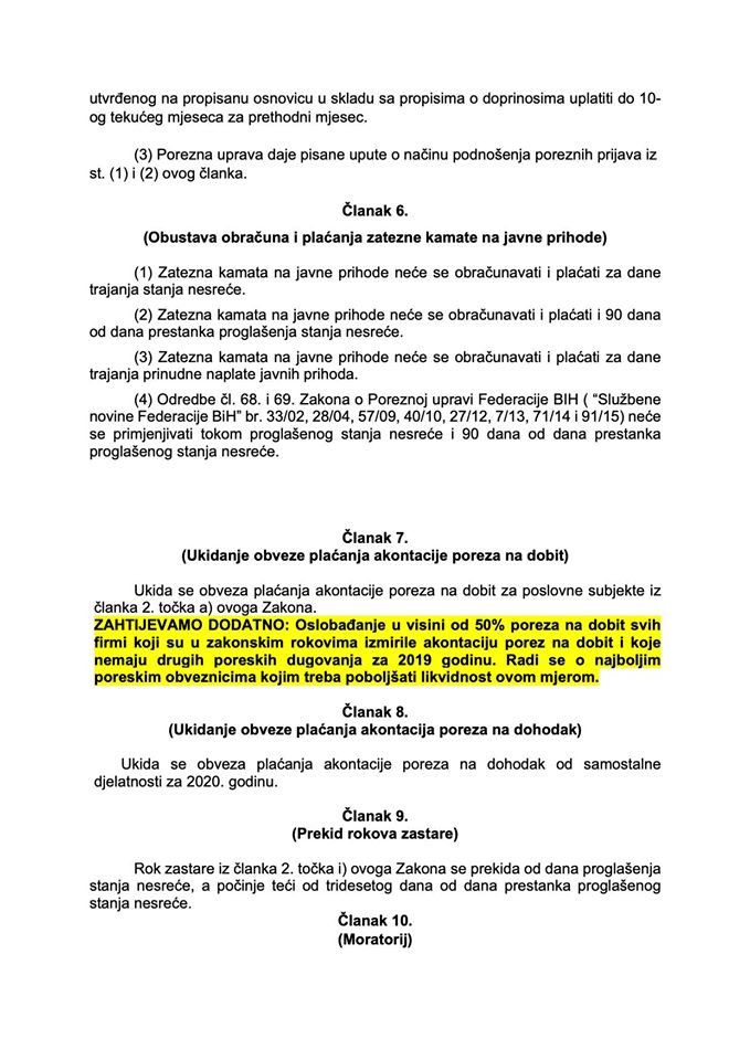 ČLAN 7 – ZAHTIJEVAMO DODATNO: Oslobađanje u visini od 50% poreza na dobit svih firmi koji su u zakonskim rokovima izmirile akontaciju porez na dobit i koje nemaju drugih poreskih dugovanja za 2019 godinu. Radi se o najboljim poreskim obveznicima kojim treba poboljšati likvidnost ovom mjerom.