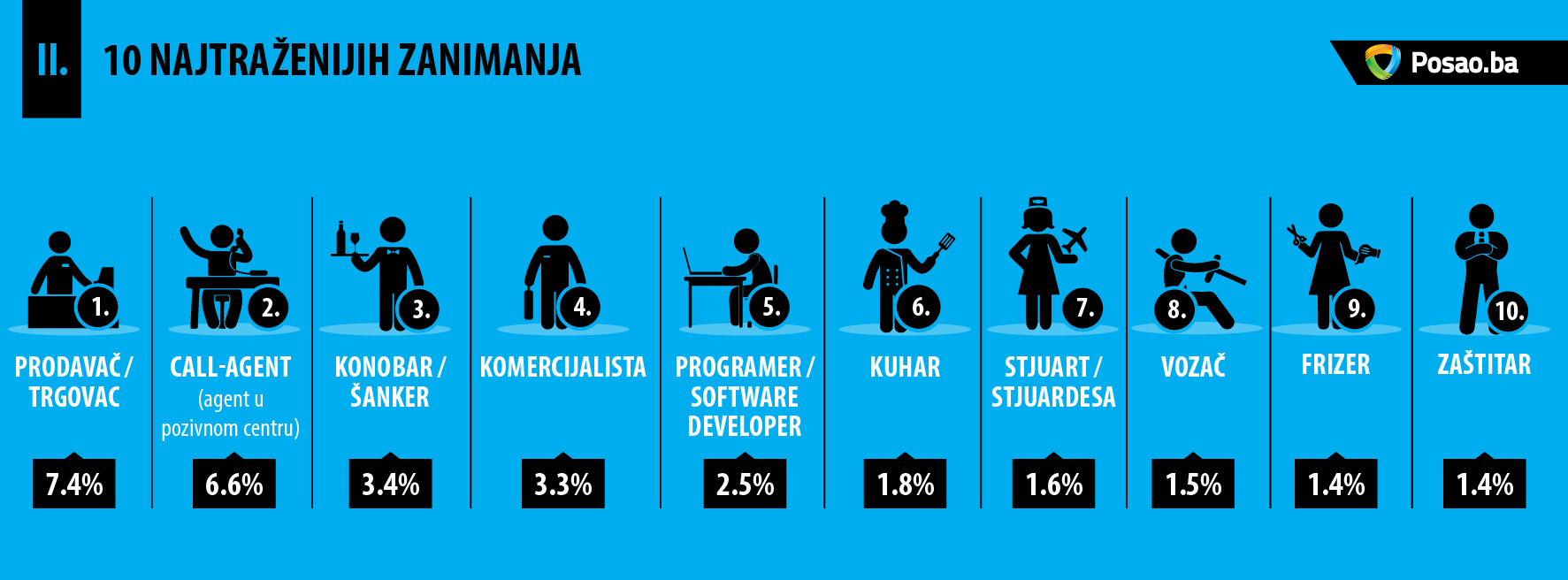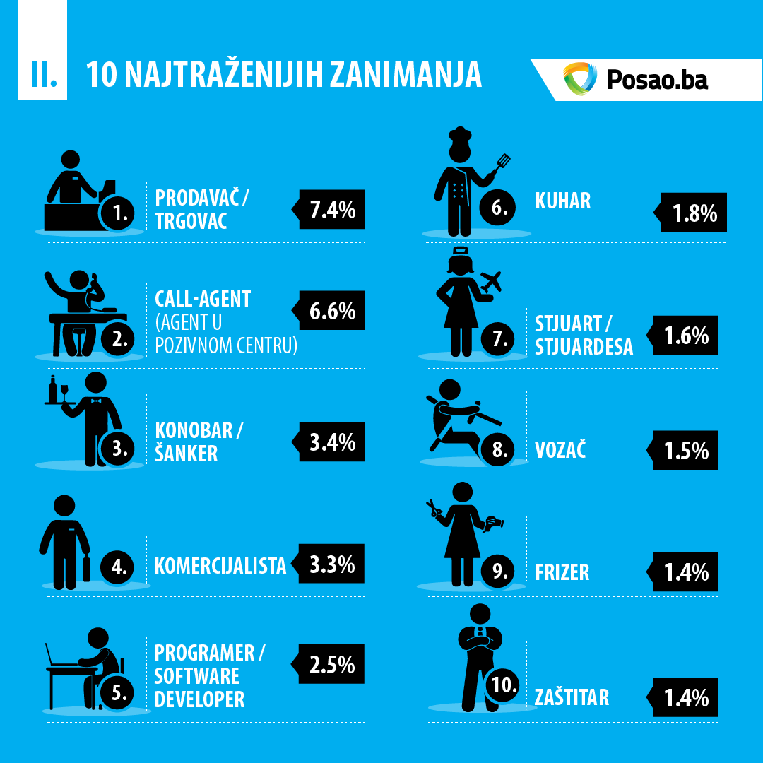 Prema broju objavljenih pozicija na portalu Posao.ba, u prvoj polovini 2017. godine bilježimo povećanu potražnju za frizerima, konobarima i prodavačima: