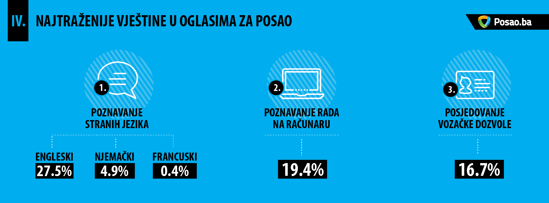 Poslodavci su, kao i u ranijem periodu, pored ključnih kvalifikacija i kompetencija koje kandidat treba da ima, najviše insistirali na poznavanju stranih jezika (najtraženiji je bio engleski jezik 27.5%), poznavanju rada na računaru (19.4%) i posjedovanju vozačke dozvole (16.7%). Ovi podaci se značajno ne razlikuju od podataka iz 2016. godine.