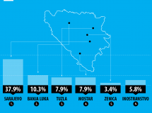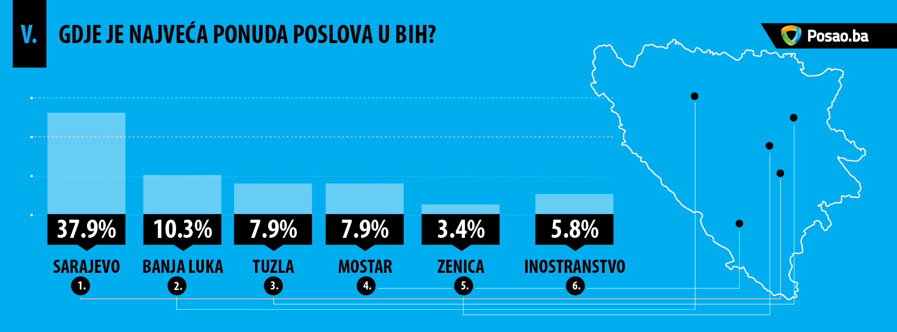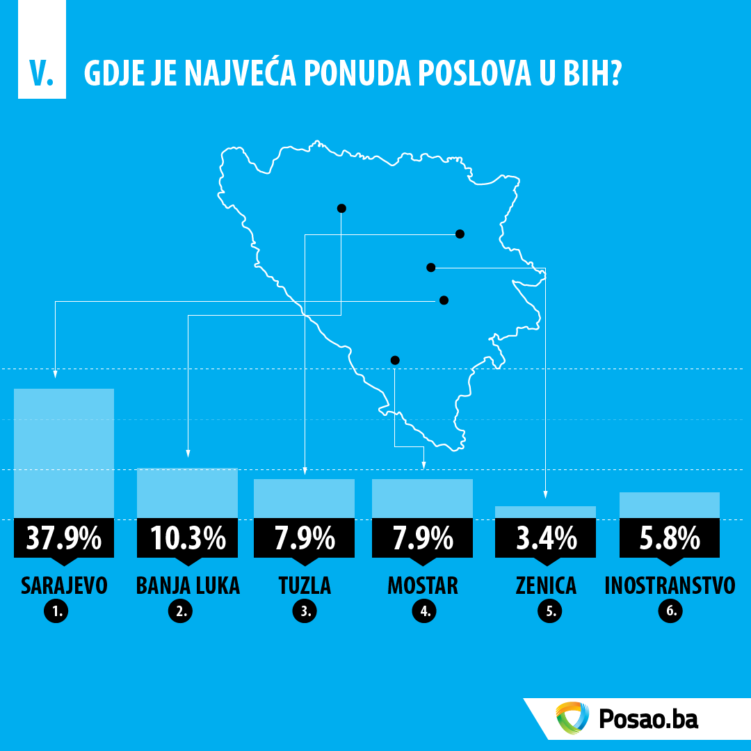 I dalje je najveća ponuda poslova za područje Sarajeva (37.9%) što predstavlja rast od 7.9% u odnosu na isti period prošle godine. Slijedi Banja Luka sa udjelom od 10.3%, Tuzla i Mostar sa po 7.9% udjela, što u odnosu na isti period prošle godine predstavlja rast od 3.2% (Tuzla) i 2.2% (Mostar).