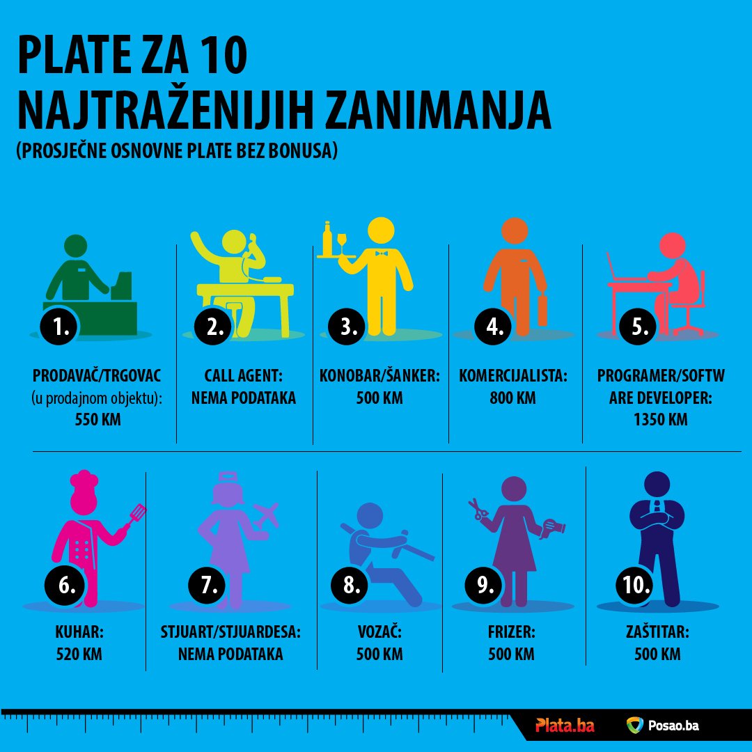 Među najplaćenijim zanimanjima u kategoriji 10 najtraženijih zanimanja u prvom kvartalu 2017. godine su programer (1.350 KM) i komercijalista (800 KM). Za sva ostala najtraženije zanimanja (Prodavač/trgovac, Kuhar, Konobar/šanker, Vozač, Frizer, itd.) plate su se kretale od 500 do 550 KM. Ovi iznosi se odnose na prosječne osnovne plate i ne uključuju bonuse.