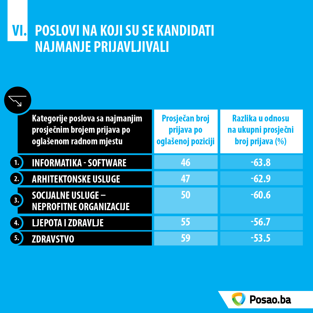 U toku godine je zabilježena kontinuirana potraga za medicinskim osobljem sa mjestom rada u Njemačkoj, dok se najveći broj drugih oglašenih pozicija u inostranstvu odnosio na pozicije u sektoru usluga podrške klijentima u Češkoj Republici: „Lufthansin centar za korisničku podršku u Brnu, Češkoj Republici, aktivno radi na privlačenju kandidata iz BiH za poziciju Customer Service Consultanta već zadnje dvije godine. Od početka godine je u procesu selekcije i regrutacije blizu 500 kandidata prošlo intervju, a oko 30 kandidata je već zaposleno“ – dodaje Mehić.