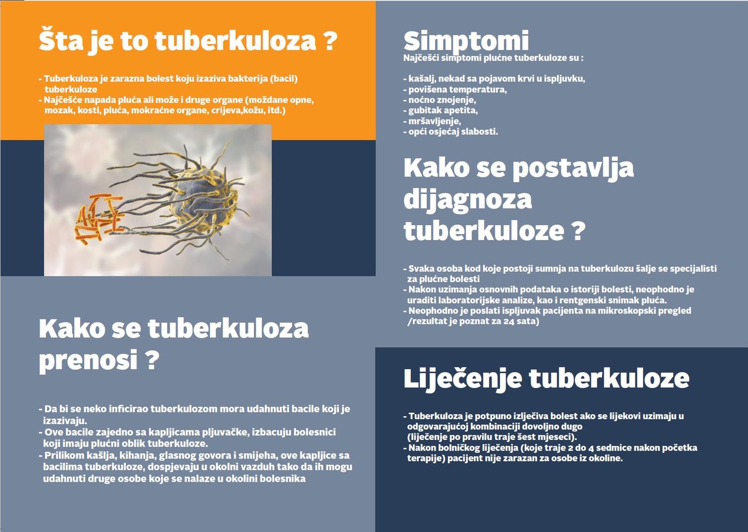 – Tuberkuloza može zahvatiti bilo koji organ u tijelu, a najčešće su to pluća. Osoba je zarazna za okolinu ako ima aktivnu tuberkulozu, što znači da u svom iskašljaju ima mikroskopski vidljive tuberkulozne mikobakterije koje, npr. kašljanjem, kihanjem, govorom ili pjevanjem može prenijeti na svoje bližnje. Bliski kontakti su osobe s kojima je bolesnik svakodnevno u kontaktu poput članova porodice, bliskih prijatelja ili kolega na radnom mjestu, navodi dr. Kozica i dodaje –