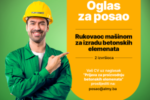 OGLAS ZA POSAO- Rukovaoc mašinom za izradu betonskih elemenata- 2 izvršioca Lokacija: Lipice – Zenica Potrebne kvalifikacije: • Minimum III stepen...
