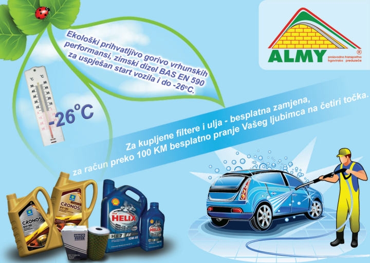 Poštovani kupci kompanije Almy, samo na našim benzinskim pumpama možete natočiti ekološki prihvatljivo gorivo vrhunskih performansi zimski dizel (BAS EN 590)...
