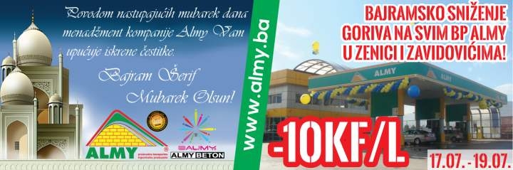 Bajramsko sniženje cijena goriva na BP ALMY – Tradicionalno bajramsko sniženje cijena goriva na BP ALMY u Zenici, Zavidovićima i Sarajevu, od 10kf/l za...
