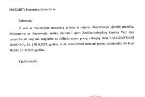Školama u ZDK preporučeno da rad usklade sa obilježavanjem prvog i drugog dana Bajrama Ministarstvo za obrazovanje, nauku, kulturu i sport Zeničko-dobojskog...