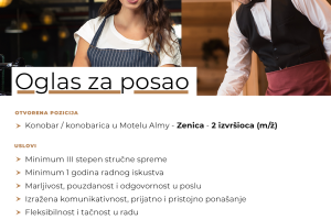 Oglas za posao: Konobar/konobarica- OGLAS ZA POSAO – Konobar / konobarica na Motelu Almy, Zenica – 2 izvršioca (m/ž) Potrebne kvalifikacije:...