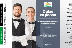 Almy d.o.o. Zenica objavljuje konkurs za prijem u radni odnos: Pozicija: Konobar/konobarica u Motelu Almy; Lokacija: Zenica; Broj izvršilaca: 1. Uslovi:...