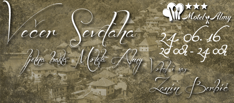 Večer sevdaha-ljetna bašta Motel Almy 24.6. u 20h – Motel Almy u prelijepom ambijentu ljetne bašte organizuje “Večer sevdaha”. “Večer...