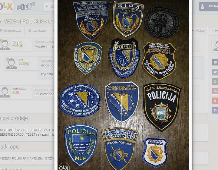 Na stranici olx.ba u rubrici kolekcionarstvo 16. septembra je postavljen oglas u kojem se prodaju vezeni policijski amblemi različitih sigurnosnih i sudskih...