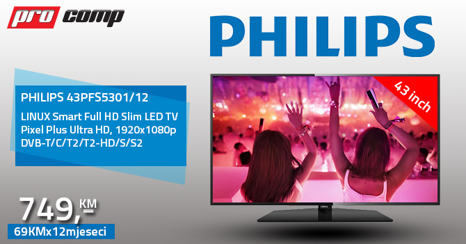 Iz našeg širokog asortimana izdvajamo, PHILIPS TV LED 43″ (108 cm) LINUX Smart Full HD Slim LED TV, Pixel Plus Ultra HD, 1920x1080p, DVB-T/C/T2/T2...