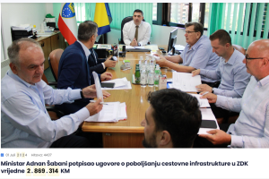 Ministar za prostorno uređenje, promet i komunikacije i zaštitu okoline Zeničko-dobojskog kantona Adnana Šabani potpisao je danas ugovore o prenosu sredstava...