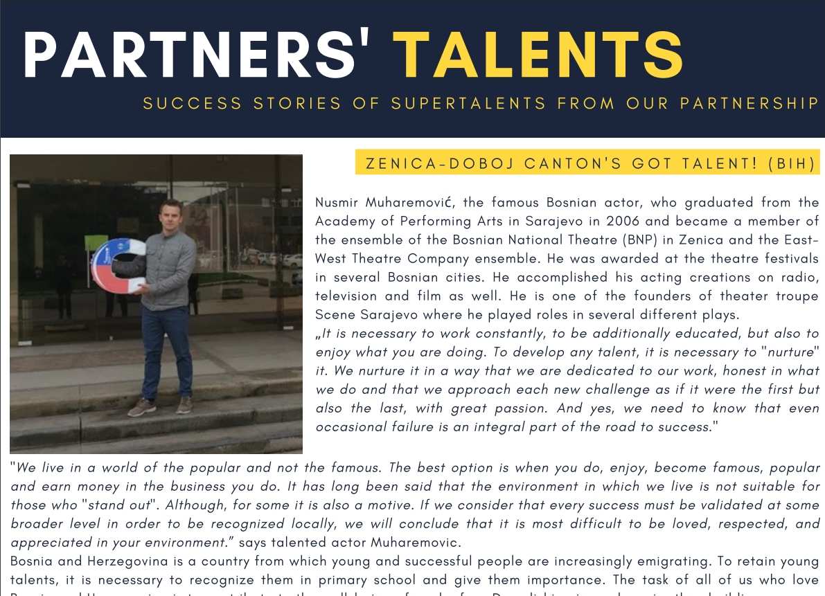 -Potrebno je stalno raditi, biti dodatno obrazovan, ali i uživati u onome što radite. Da biste razvili bilo kakav talenat, potrebno je “njegovati” to. Njegujemo ga na način da smo predani svom poslu, iskreni u onome što činimo i da svakom novom izazovu pristupamo kao da je prvi, ali ujedno i posljednji, sa velikom strašću. I da, to moramo čak i znati povremeni neuspjeh sastavni je dio puta ka uspjehu. Živimo u svijetu popularnog, a ne poznatog. Najbolja opcija je kada uživate, postanete poznati, popularni i zaradite novac u poslu kojim se bavite. Dugo se govorilo da sredina u kojoj živimo nije pogodna za one koji se “ističu”. Iako je nekima to takođe motiv. Ako smatramo da svaki uspjeh mora biti potvrđen kod nekih širem nivou da bismo bili lokalno prepoznati, zaključit ćemo da je najteže biti voljen, poštovan i cijenjeni u vašem okruženju, kaže talentovani glumac Muharemović.