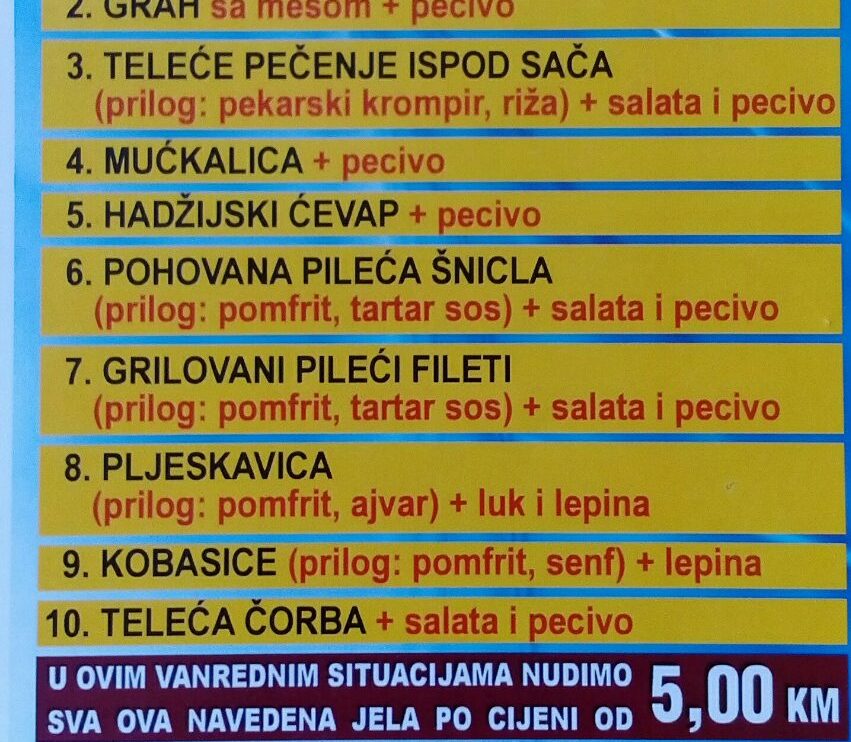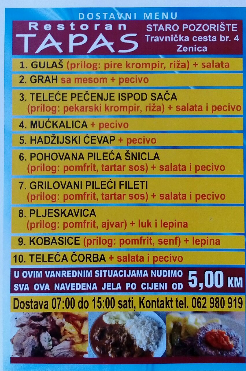 U ovoj vanrednoj situaciji nudimo usluge dostave menu-a iz ponude po jedinstvenoj cijeni od 5,00 KM.