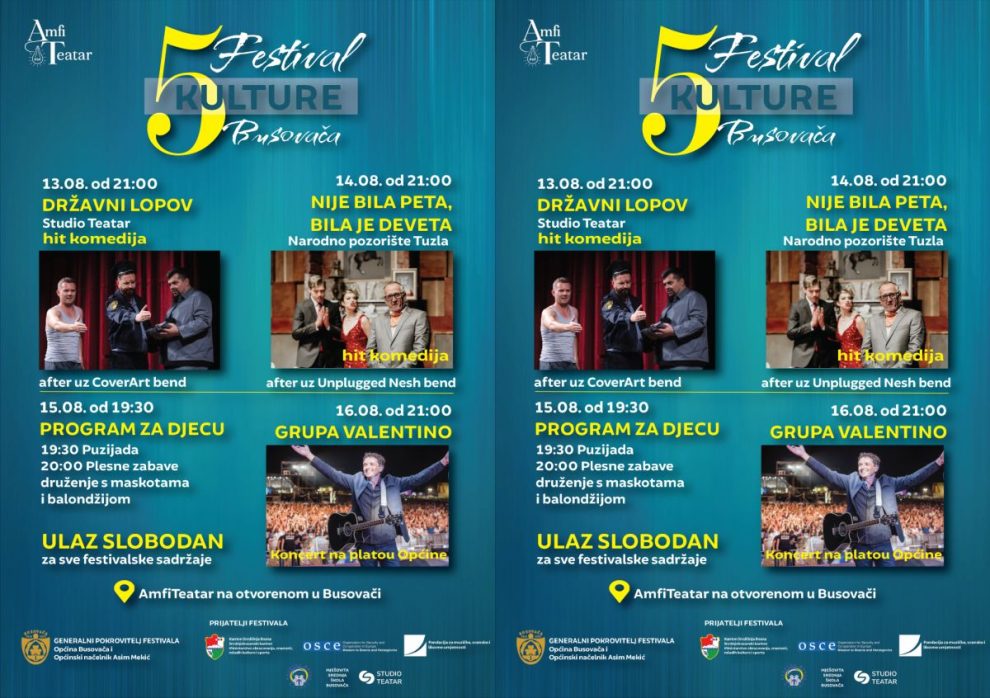 Peti međunarodni Festival kulture, Busovača 2025., ove godine će se održati od 13. do 16. 08., a publika će imati priliku da uživa u raznovrsnom programu za sve generacije. Festival otvara hit komedija Studio Teatra „Državni lopov“, nakon koje će publika uživati u svirci Cover art benda.