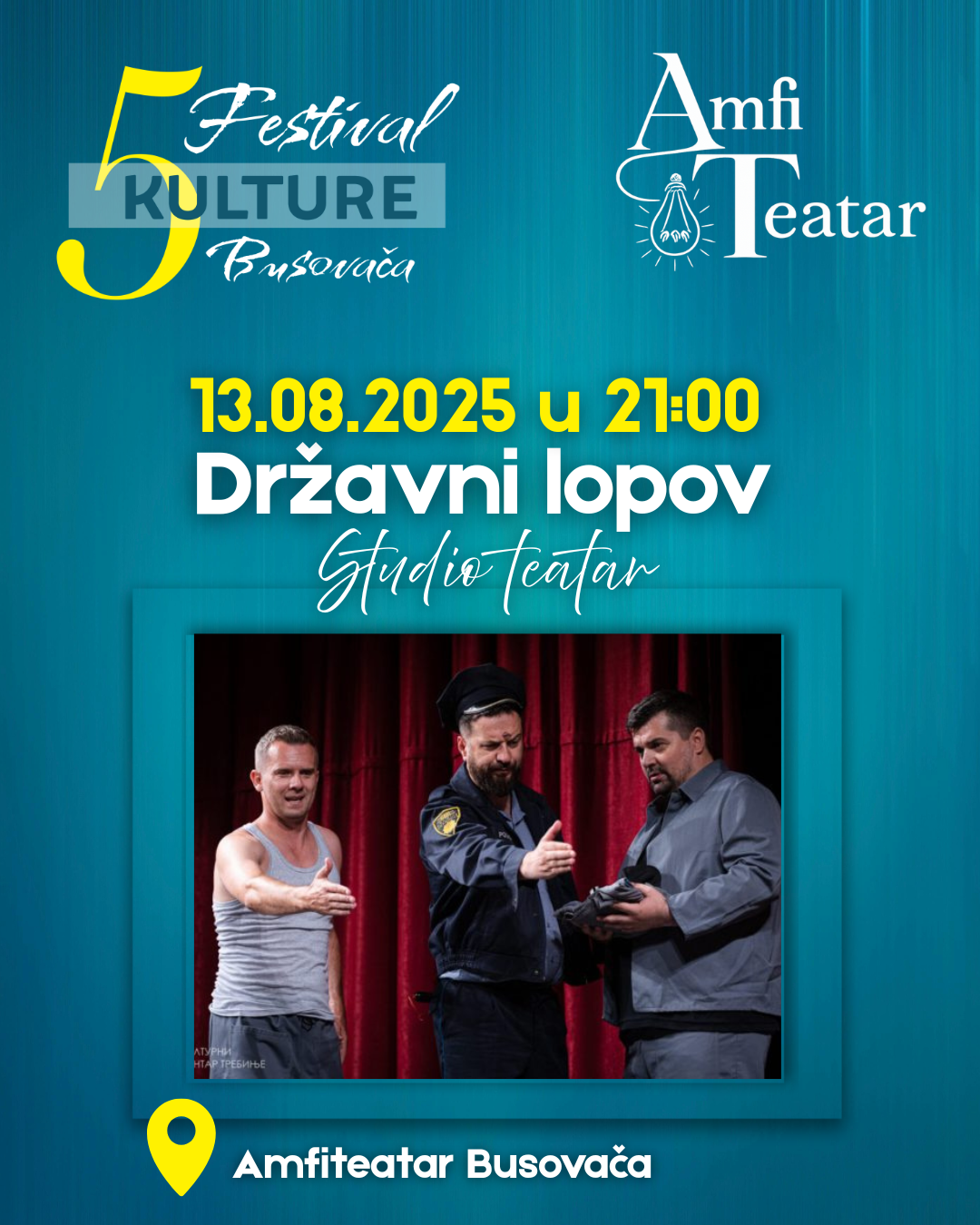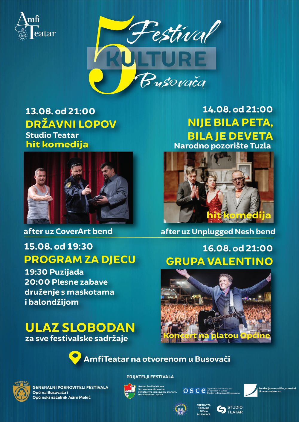 Peti međunarodni Festival kulture, Busovača 2025., ove godine će se održati od 13. do 16. 08., a publika će imati priliku da uživa u raznovrsnom programu za sve generacije. Festival otvara hit komedija Studio Teatra „Državni lopov“, nakon koje će publika uživati u svirci Cover art benda.
