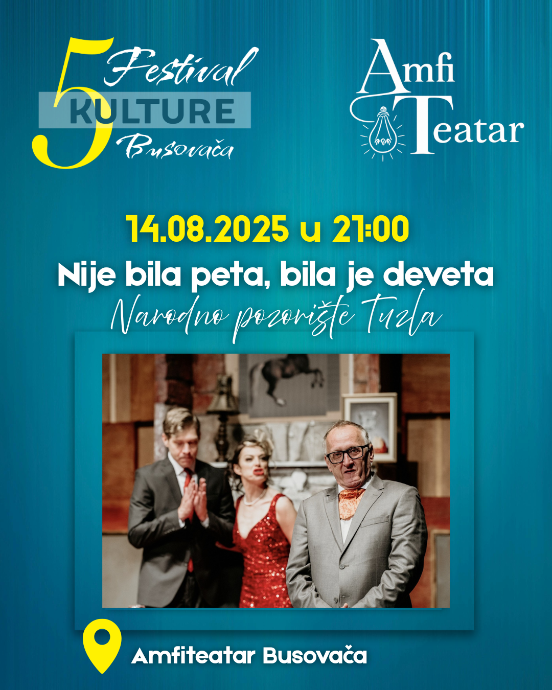 Drugu noć Festivala, publici će se predstaviti hit komedija Narodnog pozorišta Tuzla „Nije bila peta, bila je deveta“, dok će treću noć najmlađa publika uživati u sadržajima spremljenim za njih. Od 19:00 sati najmlađi će učestvovati u utrci za bebe „Puzijadi“, dok će od 19:30 h program upotpuniti plesne zabave i druženje sa balondžijom i maskotama.