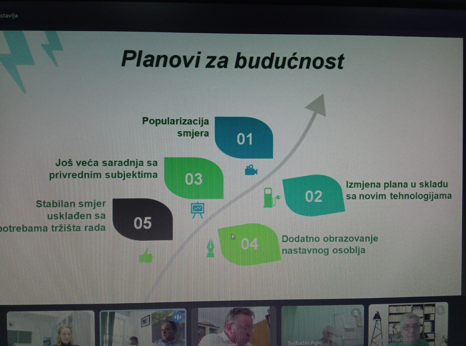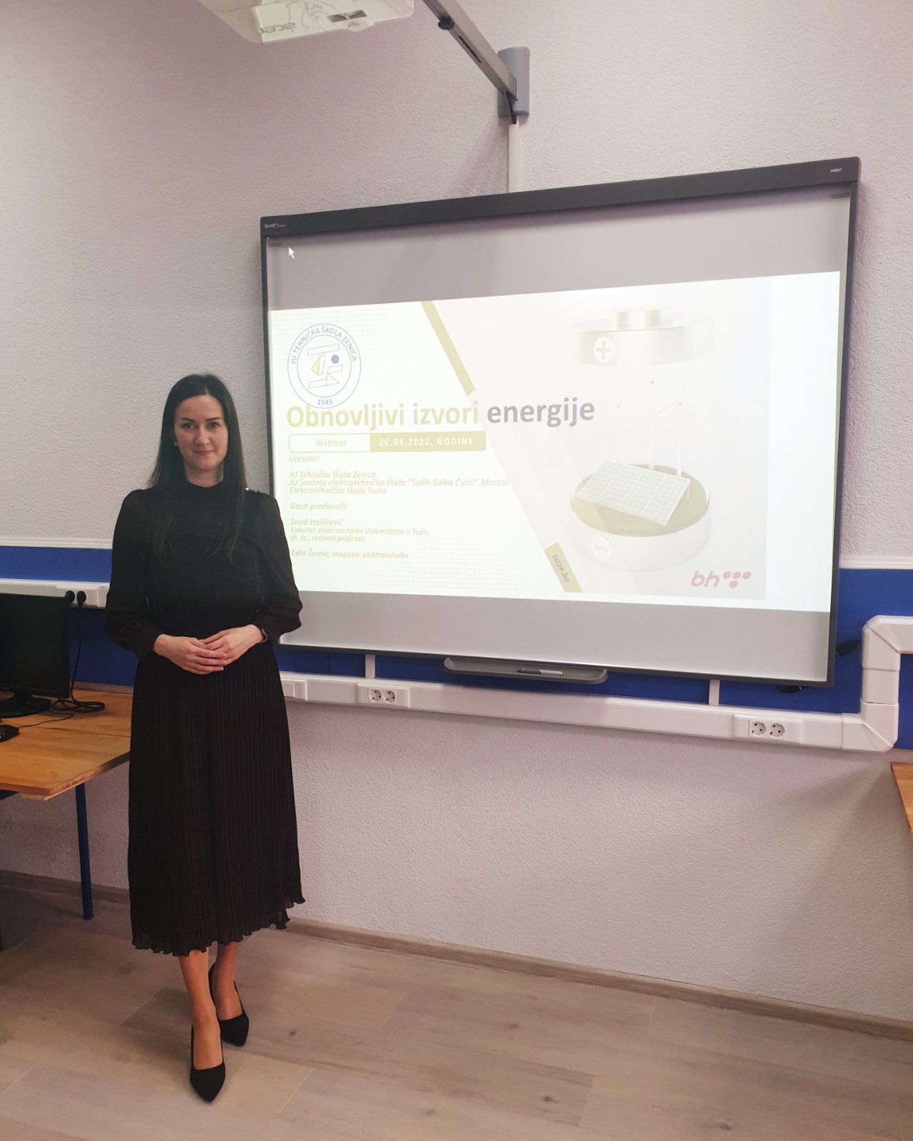 Direktor Elektrotehničke škole iz Tuzle Sejfudin Agić, dipl.ing.el predstavio je rad ove ustanove i prikazao praktične vježbe za OIE koje se provode u nastavi elektrotehničke struke, ističući važnost kontinuiranog praćenja, primjene i upotrebe novih tehnologija u elektrotehnici. Učesnici ovog webinara su bili i eminenti predavači iz oblastii energije redovni profesor Univerziteta u Tuzli- dr.sc Suad Halilčević sa temom Presjek stanja primjene OIE u energetskoj slici Bosne i Hercegovine i Edin Šemić, magistar elektrotehnike koji je predstavio potencijale Hercegovine u OIE i podatke postojećih vjetroelektrana na području Hercegovine.