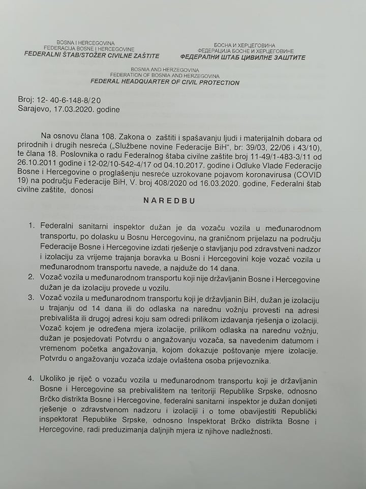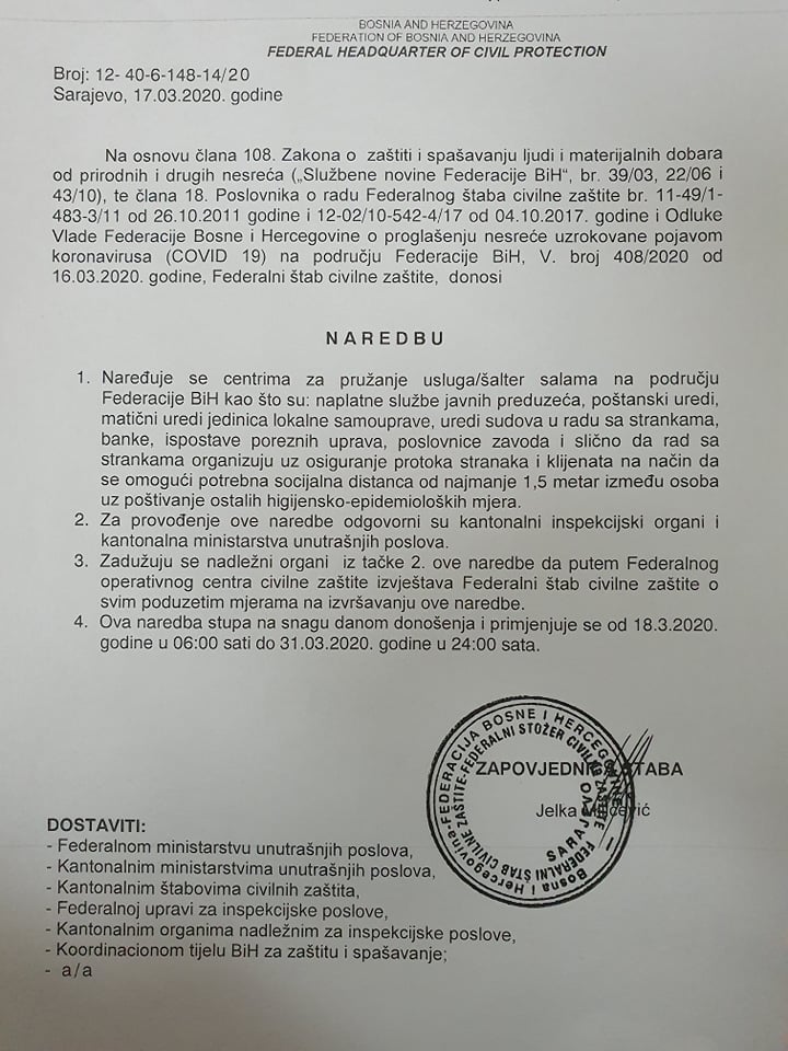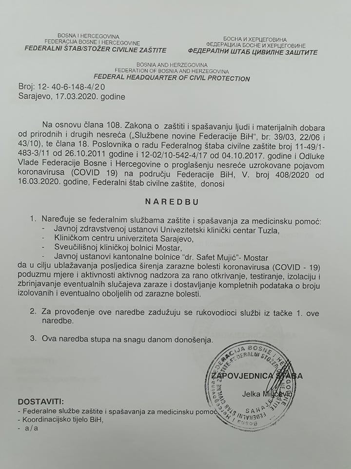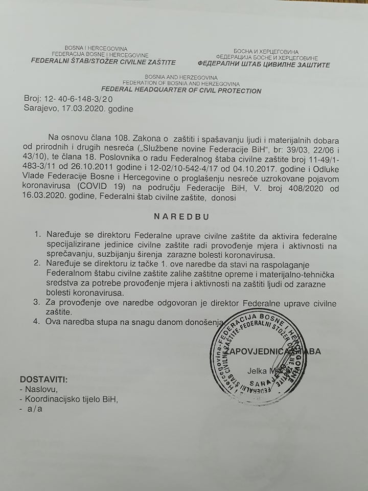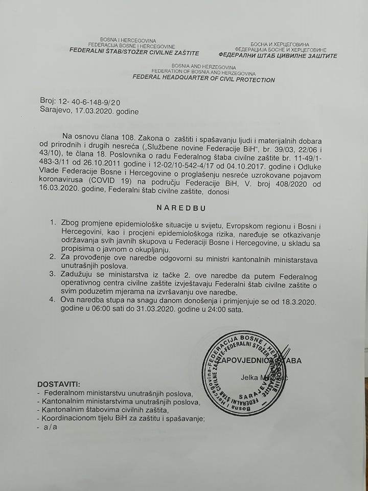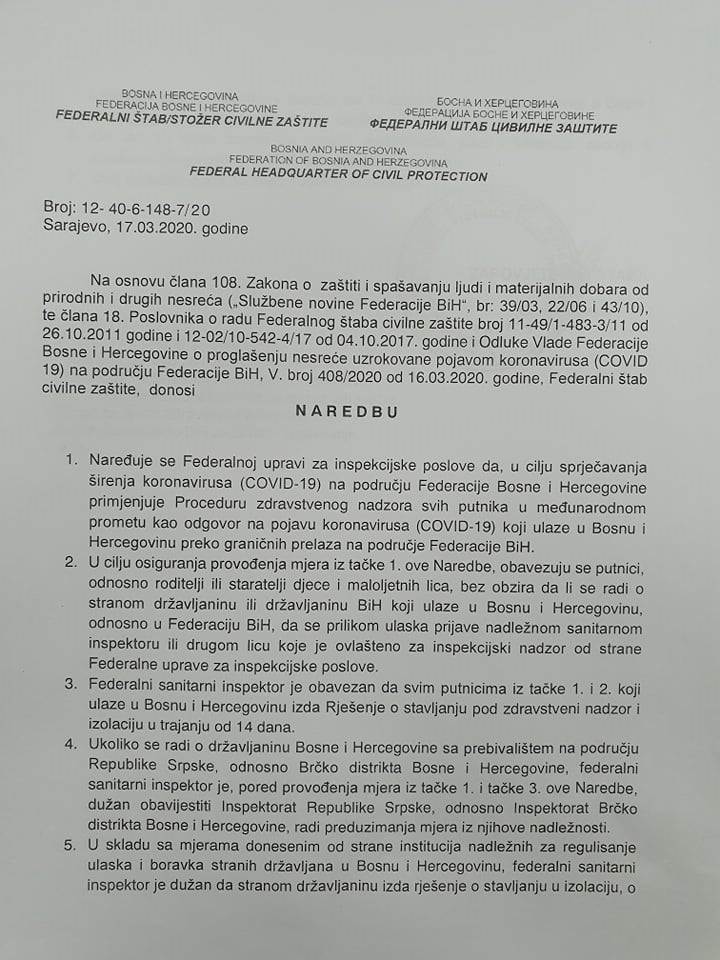 Na osnovu Zakona o zaštiti spašavanja ljudi i materijalnih dobara od prirodnih i drugih nesreća i odluke Vlade FBiH od 16. marta Federalni štab civilne zaštite donio je niz naredbi kojim će se pokušati suzbiti širenje koronavirusa na području FBiH.