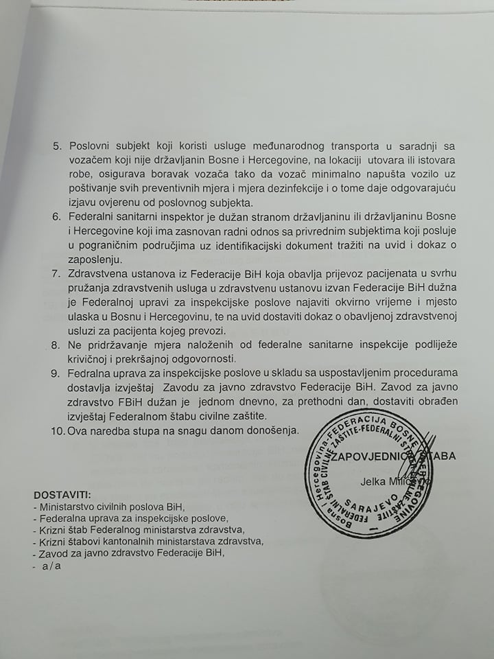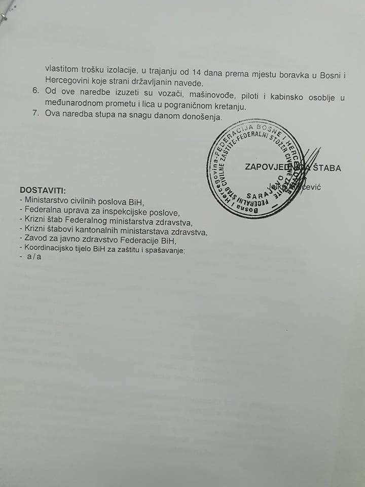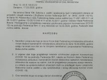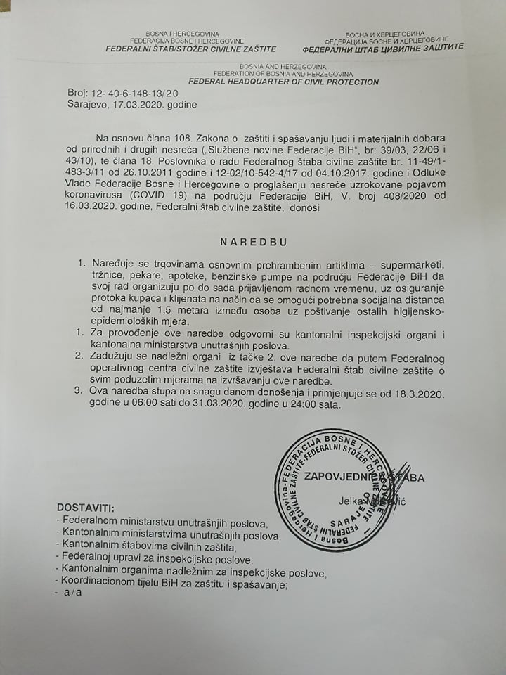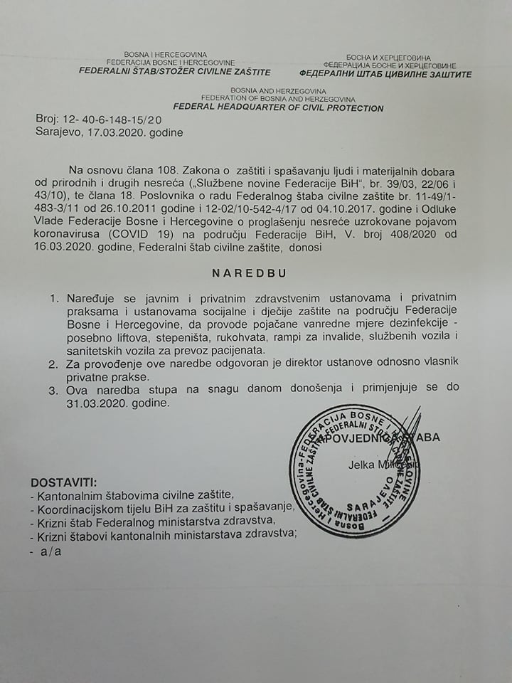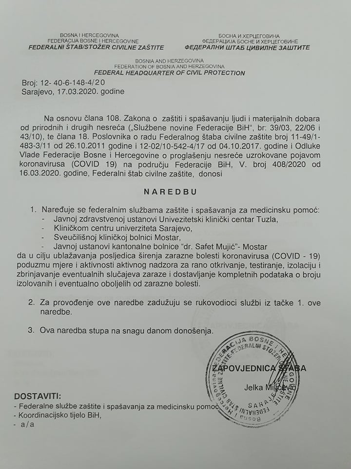 Na osnovu Zakona o zaštiti spašavanja ljudi i materijalnih dobara od prirodnih i drugih nesreća i odluke Vlade FBiH od 16. marta Federalni štab civilne zaštite donio je niz naredbi kojim će se pokušati suzbiti širenje koronavirusa na području FBiH.