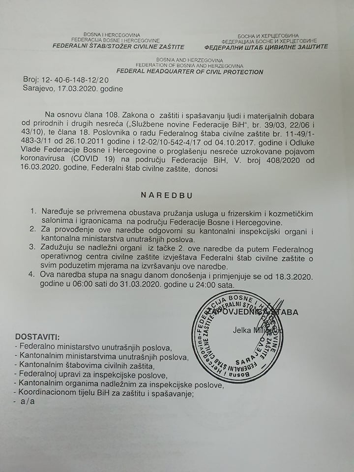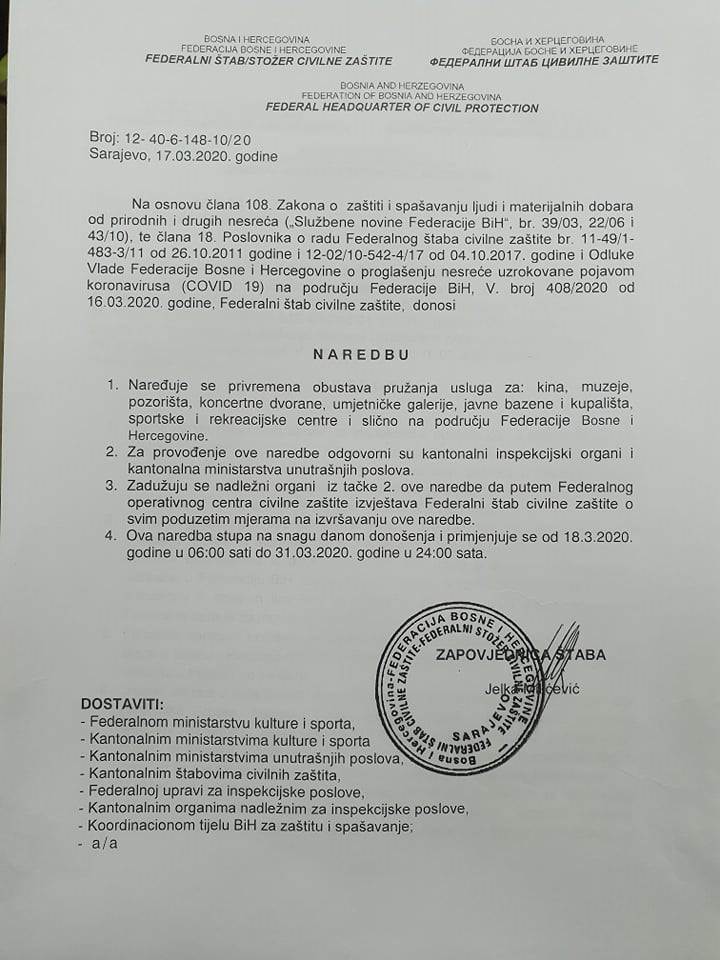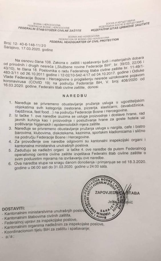 Federalni štab Civilne zaštite je donio naredbu da se zabranjuju sva javna okupljanja, obustavlja se rad svim ugostiteljskim objektima za pripremanje i prodaju hrane i pića, restoranima, pizerijama, slastičarnama, nargila barovima, kafe barovima, disko-barovi, čajdžinicama, kafeima.