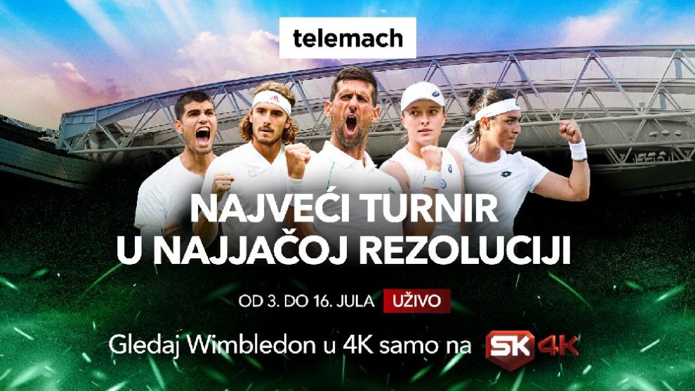 Vrijeme je za Wimbledon, sportski spektakl koji željno iščekuju ljubitelji tenisa širom svijeta. Zahvaljujući kompaniji Telemach BH, od 3. do 16. jula, putem EON platforme u mečevima vrhunskih igrača Wimbledona moći će uživati i gledatelji u Bosni i Hercegovini. Mečevi s centralnog terena će se prenositi uživo na Sport Klub 4K kanalu u najjačoj, ultra HD rezoluciji, koja skupa s 4K tehnologijom omogućava vrhunsko iskustvo u gledanju TV programa.
