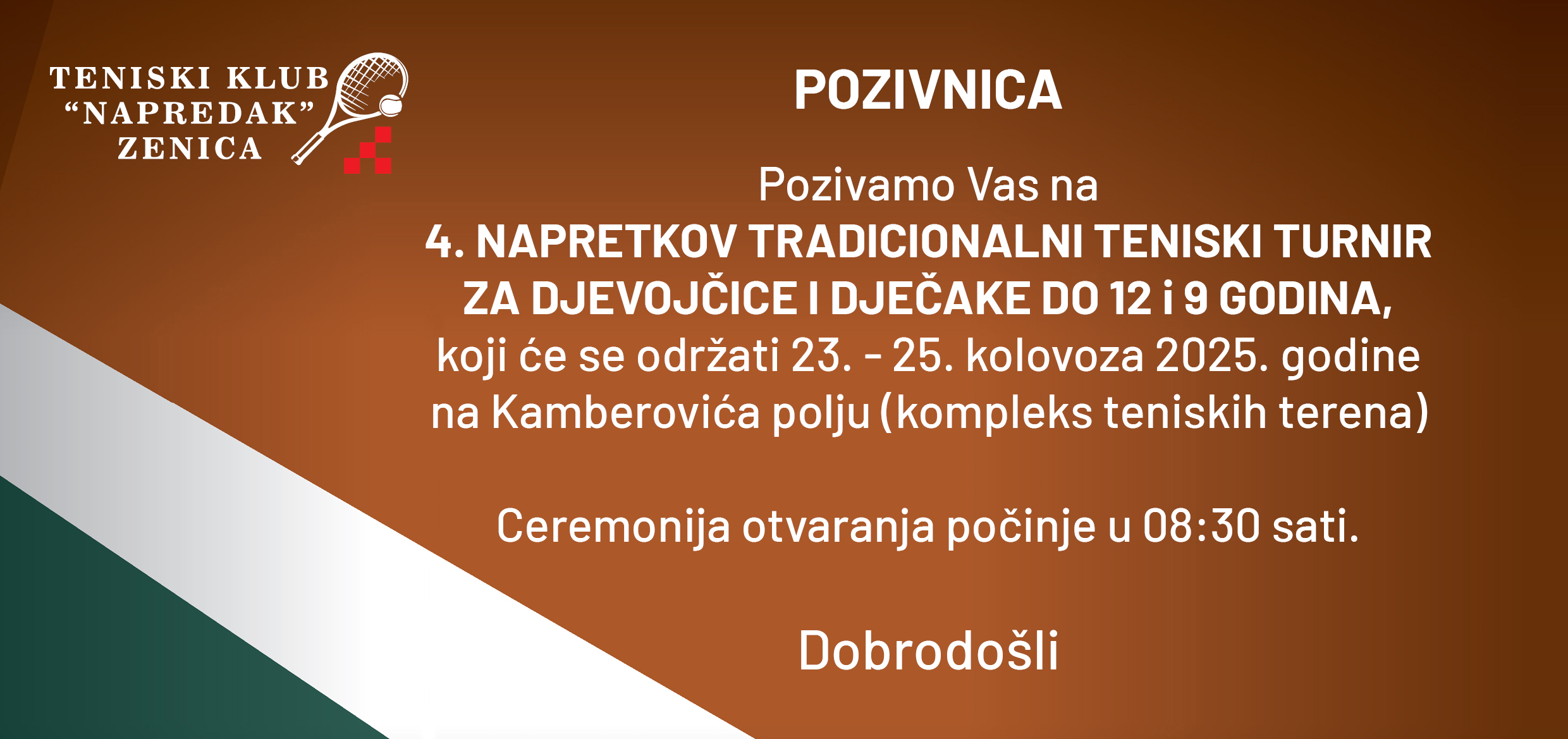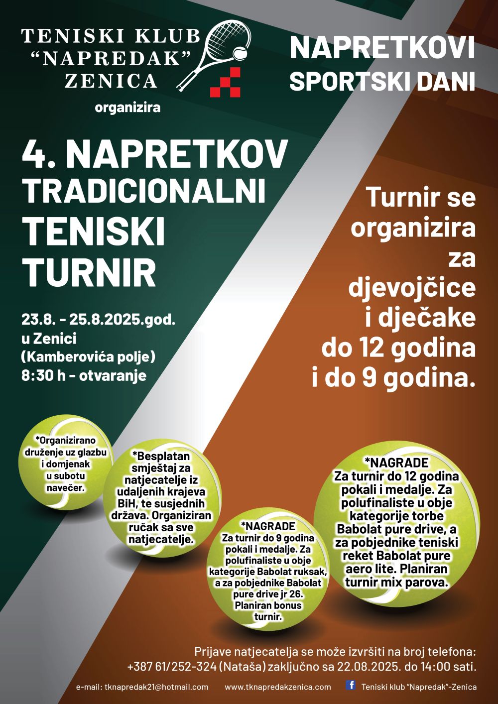 Teniski klub „Napredak“ Zenica će u periodu od 23.08. do 25.08.2025. godine, u sklopu manifestacije Napretkovi sportski dani, organizovati „IV. tradicionalni napretkov teniski turnir Zenica 2025“ za djevojčice i dječake do 12 i do 9 godina na kompleksu teniskih terena na Kamberovića polju.