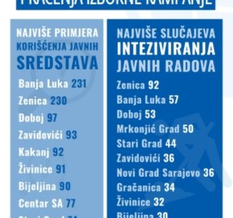 Tokom kampanje u 32 slučaja oprema javnih preduzeća i institucija korišćena je za postavljanje stranačkih plakata i organizacije predizbornih skupova. U Bugojnom su radnici javnog komunalnog preduzeća postavljali plakate kandidata SDA, a radnici ektrodistribucije u Bijeljini i Čelincu postavljali su plakate SNSD-a.