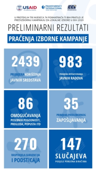 U protekla tri mjeseca posmatrači TI BIH ispratili su 945 javnih događaja koje su organizovale institucije i javna preduzeća, a na 62% tih događaja prisutnima su se obraćali kandidati na lokalnim izborima, što jasno pokazuje njihovu svrhu. Od tog broja 226 javnih događaja organizovano je povodom otvaranja infrastrukturnih objekata što dovoljno govori o razmjerama korišćenja javnih resursa u kampanji i povećanju javne potrošnje u svrhu predizborne promocije.
