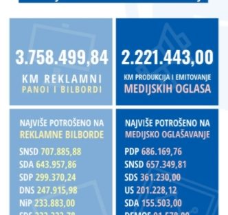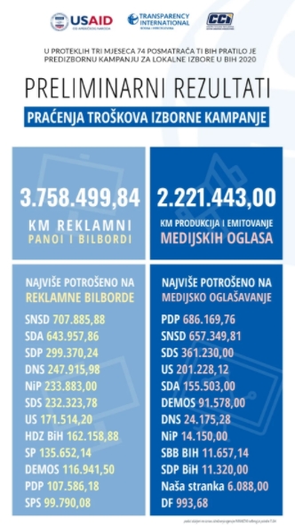 Najviše novca na ovaj vid oglašavanja do sada su potrošile SNSD (1,36 miliona KM), SDA i PDP (po 800 hiljada KM), SDS (oko 600 hiljada KM), Ujedinjena Srpska (preko 370 hiljada KM) i SDP (preko 310 hiljada). S druge strane, ni jedna stranka u BIH nije dostavila na upit TI BIH plan troškova izborne kampanje koji su za prošle izbore prijavljeni u iznosu preko 10 miliona KM.