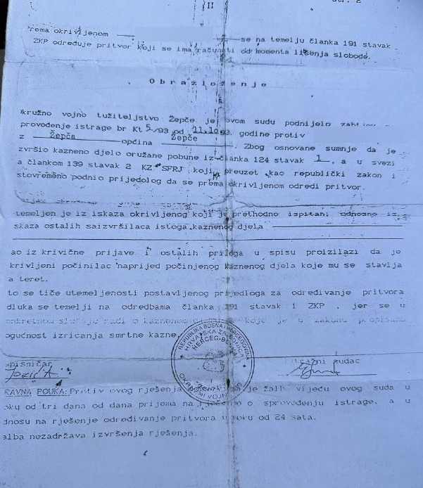 U faksimilu kojeg posjedujemo, Jukić je odredio pritvor jednom logorašu tokom provođenja istrage i to zbog osnovane sumnje da je izvršio kazneno djelo oružane pobune za koje je u slučaju počinjena bila predviđena i mogućnost izricanja smrtne kazne.