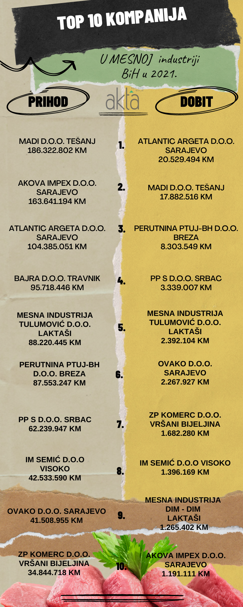 Poslovni portal Akta.ba napravio je analizu TOP 10 kompanija BiH iz oblasti mesne industrije po ostvarenom prihodu i dobiti u 2021.