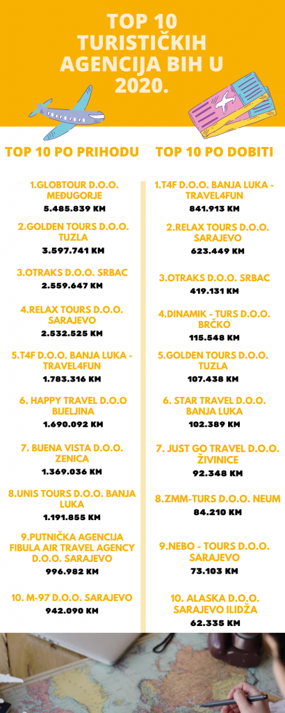 Na listi su TOP 10 agencija koje imaju klasifikaciju djelatnosti putničkih agencija, djelatnosti turoperatora, djelatnosti putničkih agencija i turoperatora ili ostalih usluga turistima.