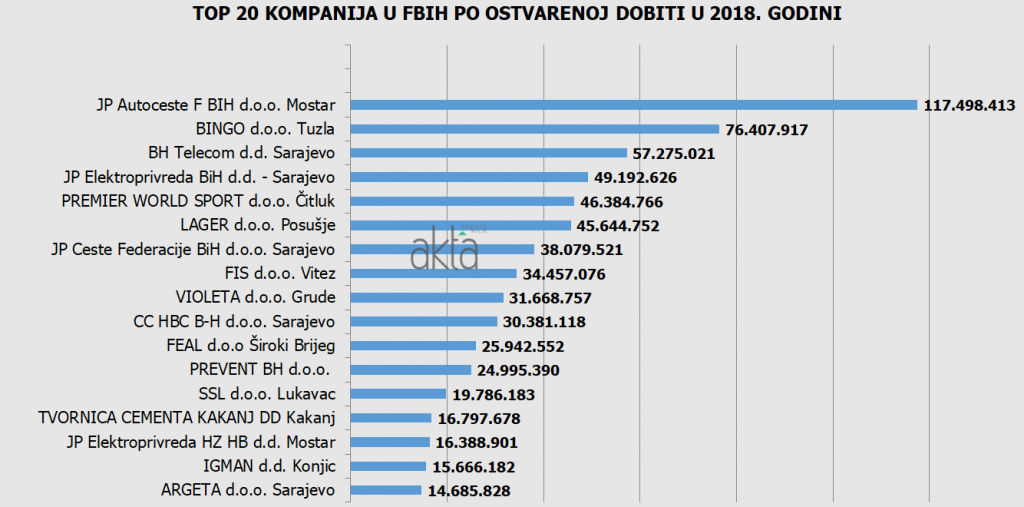 Na listi top 20 kompanija po ostvarenoj dobiti prve su JP Autoceste FBIH d.o.o. Mostar sa 117.498.413 KM, drugi je BINGO d.o.o. Tuzla sa 76.407.917 KM, treći BH Telecom d.d. Sarajevo sa 57.275.021 KM, četvrta je JP Elektroprivreda BiH d.d. sa 49.192.626 KM dobiti. Peti je PREMIER WORLD SPORT d.o.o. Čitluk sa 46.384.766 KM, šesti LAGER d.o.o. Posušje sa 45.644.752 KM, sedme JP Ceste Federacije BiH d.o.o. Sarajevo sa 38.079.521 KM, osmi FIS d.o.o. Vitez sa 34.457.076 KM, deveta je VIOLETA d.o.o. Grude sa 31.668.757 KM, deseta CC HBC B-H d.o.o. Sarajevo sa 30.381.118 KM dobiti…