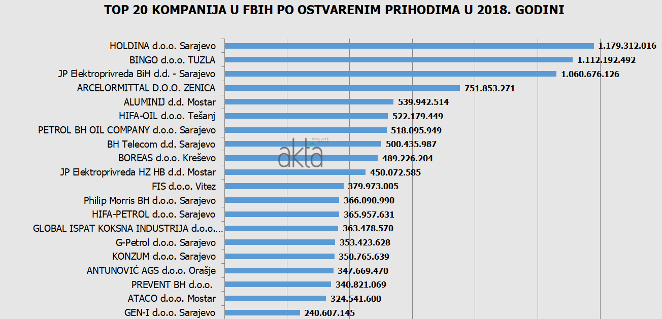 “Top 20” kompanija u FBiH sa najvećim prihodom i dobiti u 2018. godini – Poslovni portal Akta.ba i ove godine donosi analizu poslovanja top 20 kompanija u FBIH po ukupnom prihodu i dobiti, a prema finansijskim pokazateljima za 2018. godinu.