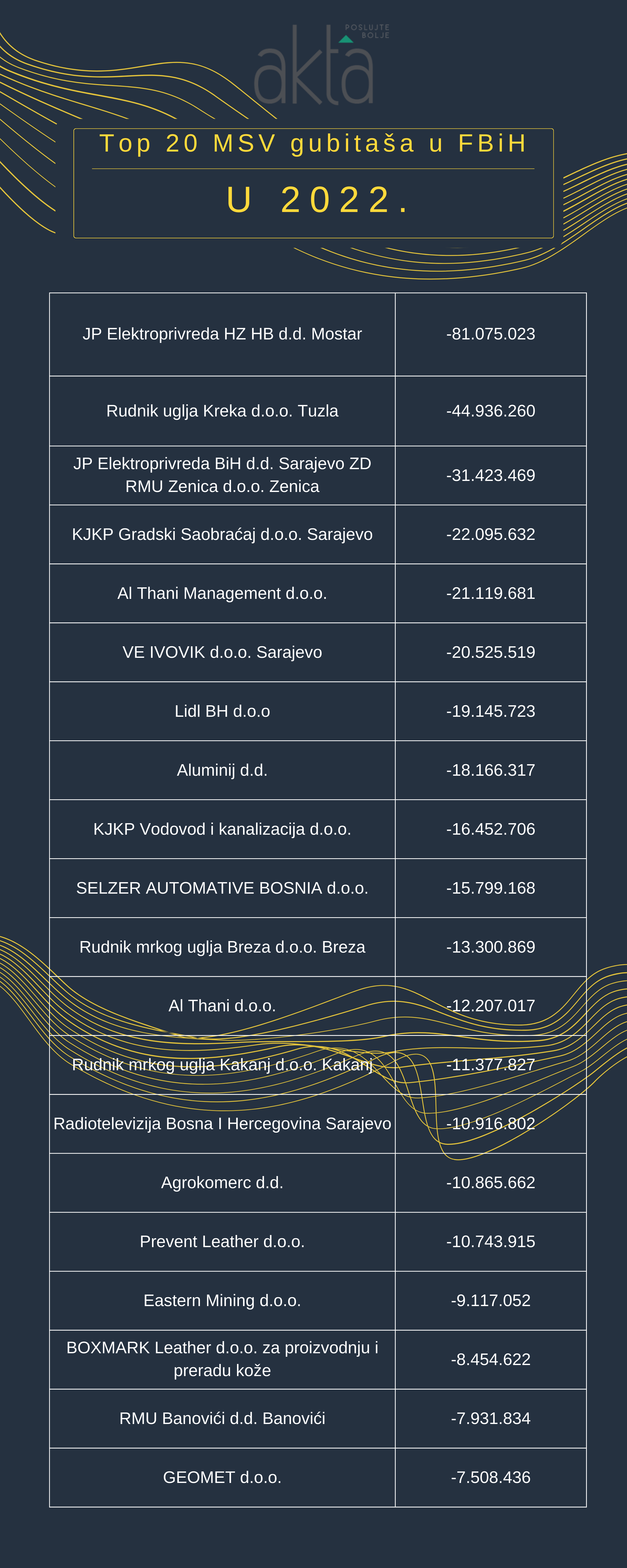 Zadnji na listi su RMU Banovići d.d. Banovići sa gubitkom od -7.931.834 KM i GEOMET d.o.o. sa -7.508.436 KM.