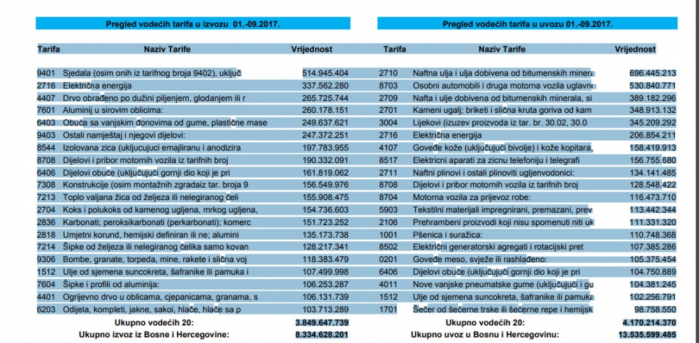 Za devet mjeseci izvoz je iznosio 8.334.628.201 KM, dok je uvoz bio za oko 40 posto veći i iznosio je 13.535.599.485 KM. Najznačajniji trgovinski partneri BiH u 2017. godini kada je riječ o uvozu su Hrvatska, Srbija, Njemačka, Slovenija, Hrvatska, Austrija, Mađarska, Turska, Ruska Federacija, SAD,  Poljska i na 12 mjestu Švajcarska. Kada je riječ o izvozu u tekućoj godini najviše smo izvozili u Njemačku, Hrvatsku, Italiju, Srbiju, Sloveniju, Austriju, Tursku, Crna Goru, Holandiju i Mađarsku.